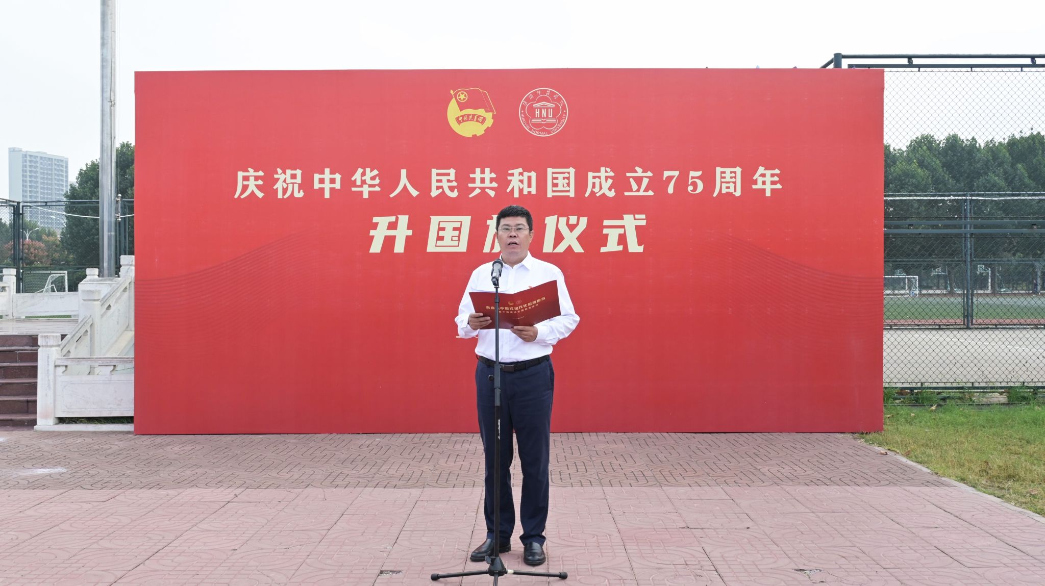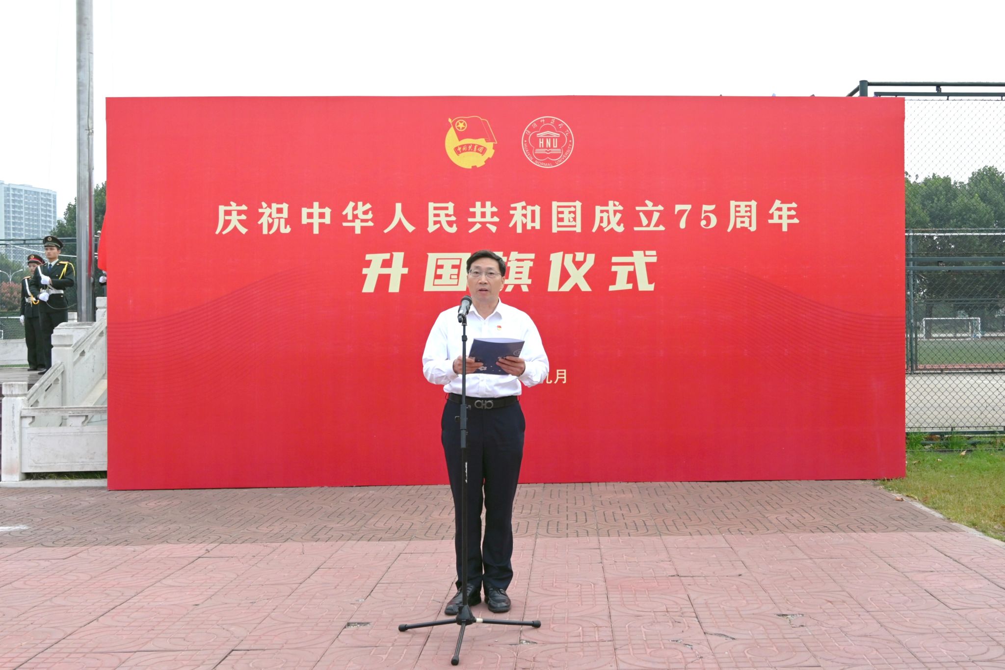 图为淮师举行庆祝中华人民共和国成立75周年升国旗仪式。记者 付裕 摄