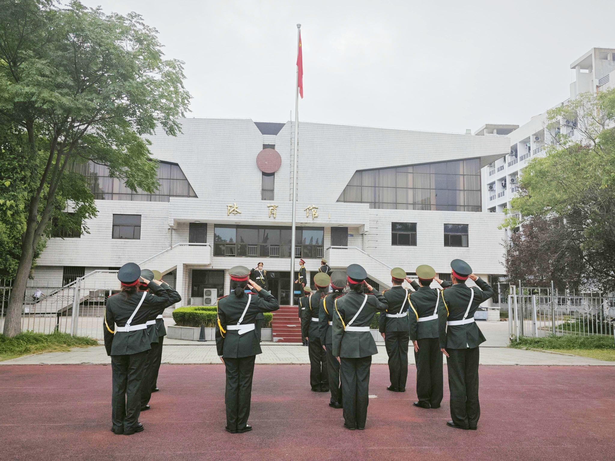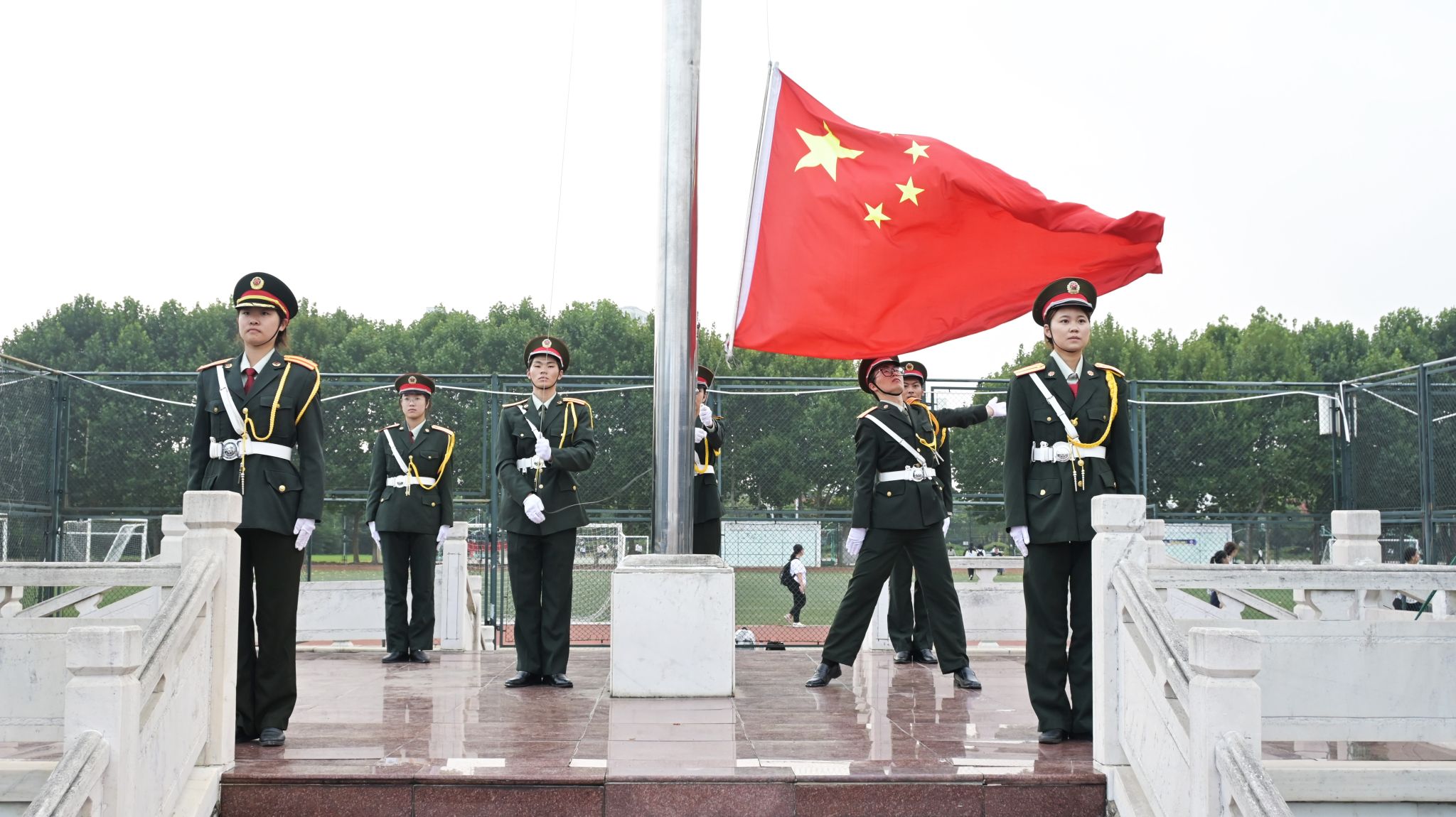 伴随着雄壮激昂的《义勇军进行曲》,鲜艳的五星红旗迎风展开、冉冉升起。全体人员列队肃立,向国旗行注目礼,齐声高唱国歌,表达对伟大祖国的无限热爱和深情祝福。