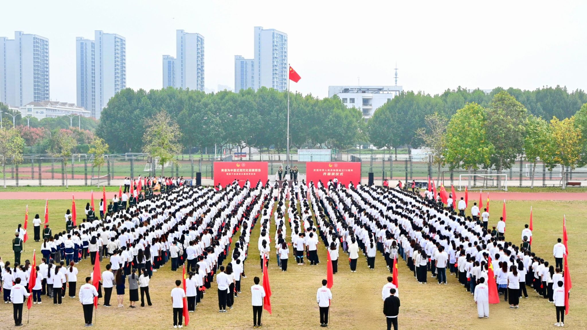 淮师新闻网9月30日电(记者 董旭冉)9月30日上午7点,万象城awcsport官网在长江路校区、交通路校区田径场举行庆祝中华人民共和国成立75周年升国旗仪式。校长赵宜江,党委副书记韩同友,副校长闫超栋、毛广雄出席仪式。校党委委员、纪委委员、二级学院党委主要负责同志以及全校师生代表2000余人参加仪式。韩同友主持升国旗仪式。