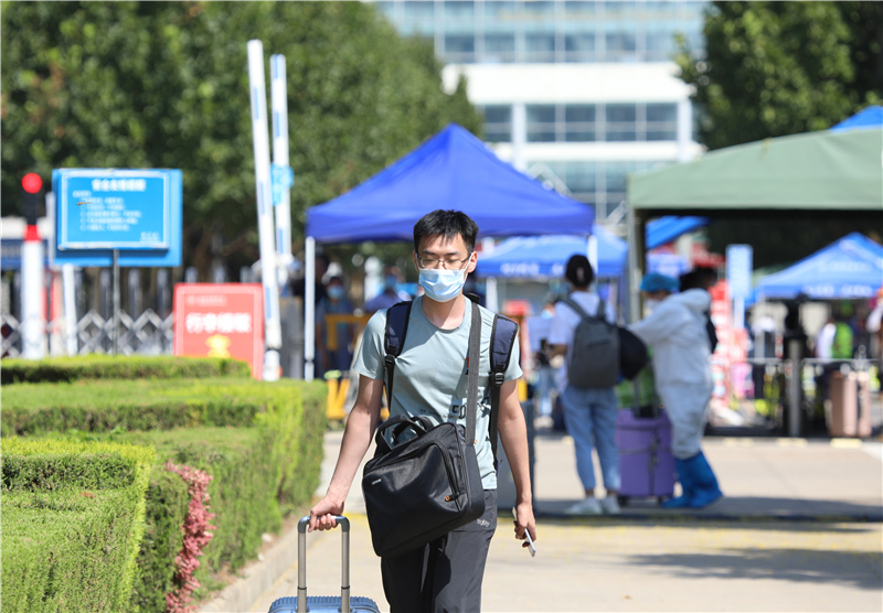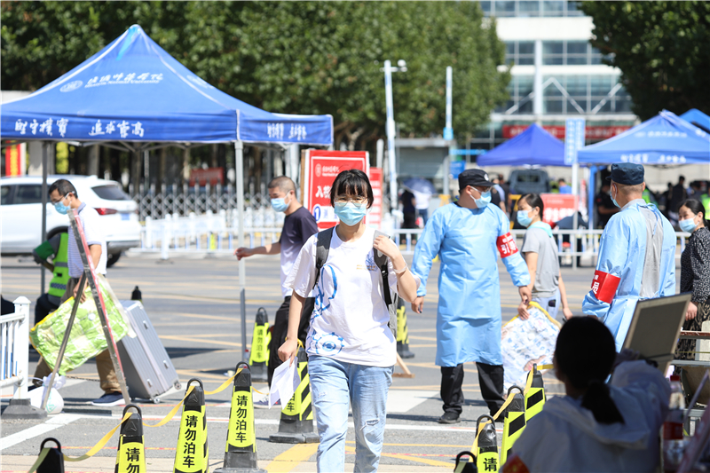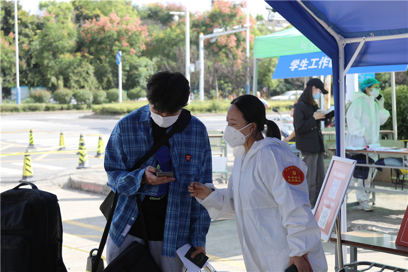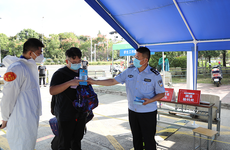 返校报到处,返校学生均按要求佩戴口罩,在学校工作人员和教师志愿者的引导下,保持1米以上安全间隔有序排队,依次有序进行体温测量、核酸检测证明查验、健康码和行程码查验、报到信息核验、消毒、提交健康承诺书等流程,审核通过后进入校园。