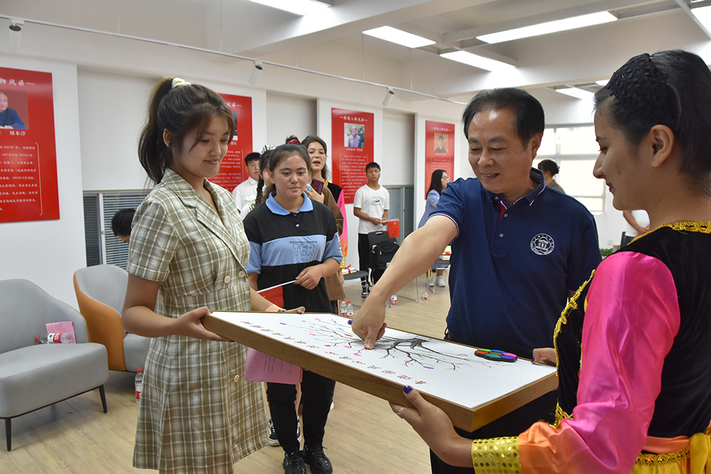 能歌善舞的少数民族学生买吾拉·吾斯曼现场弹唱了充满异域风情的歌曲《再看你一眼》,展现了民族音乐的瑰宝魅力;预科班木克热木·麦麦提艾力带来歌曲《隐形的翅膀》,唱出了无形的力量。活动最后全体师生齐唱《歌唱祖国》,同学们在指纹树上按下手印,表达共庆国庆佳节、同栽团结之树的美好愿景。整场活动主题鲜明,内容丰富,始终洋溢着团结向上的主旋律,营造出温馨和谐的喜庆氛围。