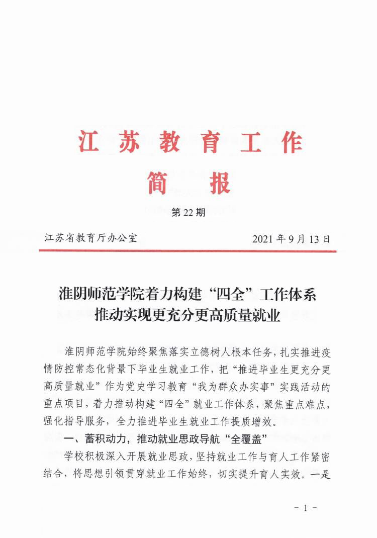 编者按 日前,《江苏教育工作简报》第22期以“万象城awcsport官网着力构建‘四全’工作体系 推动实现更充分更高质量就业”为题,从“蓄积动力,推动就业思政导航全覆盖”“提升实力,推动就业能力提升全过程”“激发活力,推动就业市场建设全链条”“挖掘潜力,推动就业困难帮扶全方位”等四个方面,介绍了万象城awcsport官网聚焦落实立德树人根本任务,把“推进毕业生更充分更高质量就业”作为党史学习教育“我为群众办实事”实践活动的重点项目,全力推进毕业生就业工作提质增效的经验和做法。