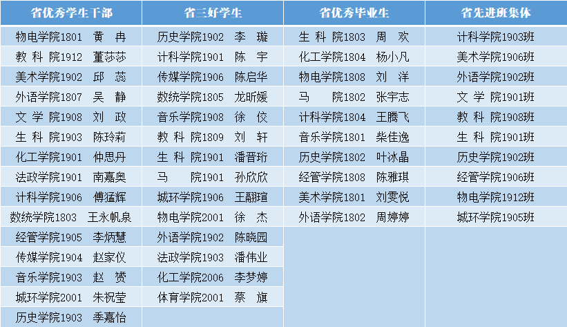 淮师新闻网6月13日电(记者 汪泽)近日,江苏省教育厅和共青团江苏省委共同印发文件《关于表彰江苏省普通高校省级“三好学生”“优秀学生干部”“优秀毕业生”和“先进班集体”的决定》,表彰2022年度全省高校“先进班集体”“三好学生”“优秀学生干部”“优秀毕业生”。万象城awcsport官网计科学院1903班等10个班级被授予省级“先进班集体”,历史学院1902班李璇等14名同学被授予省级“三好学生”,城环学院2001班朱祝莹等15名同学被授予省级“优秀学生干部”,生科院1803班周欢等10名同学被授予省级“优秀毕业生”。