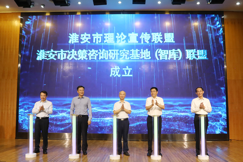 启动仪式上,赵金松、张新科、李森、朱汉清、孙爱武共同为淮安市理论宣传联盟暨决策咨询研究基地(智库)联盟成立按下启动按钮。