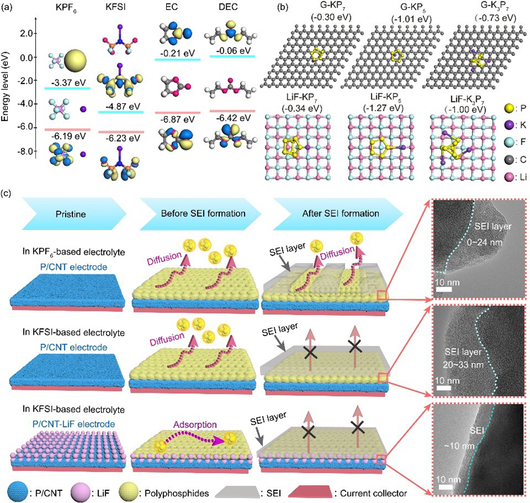 该项工作揭示了快充型钾离子磷负极的储钾新机制—溶出机制:可溶性的多磷化钾中间产物在电解液中发生跨膜穿梭,导致活性磷的损失,从而引起电化学循环稳定性的衰减。针对如上问题,通过调控电解液的组成促使电极表面形成均匀、稳定和致密的SEI层,阻隔了多磷化钾在循环过程中持续溶出,进而提高了磷负极的循环稳定性。同时引入LiF功能性吸附材料以防止SEI形成前可溶物的溶出与扩散,在随后的充放电中与形成的SEI层协同作用,形成薄而均匀的SEI层,提高了电池的首次库伦效率和可逆比容量,经过100次循环后,放电比容量高达507.6 mAh g-1,库伦效率为99.3%。该机理的研究与材料的设计思路为磷及其他电极材料的失效机制研究提供了新思路。