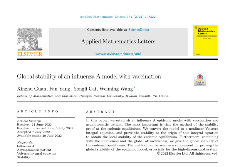 淮师新闻网10月15日电(记者 刘咪)近日,数学与统计学院数学与应用数学专业2007班学生管新竹在《应用数学快报》(Applied Mathematics Letters)上以第一作者发表论文《Global stability of an influenza A model with vaccination》(一类考虑接种的甲型流感模型的全局稳定性)。《应用数学快报》是具有广泛影响的国际顶级学术刊物,主要涉及领域为应用数学,2021年影响因子4.294,中科院二区期刊(JCR一区TOP期刊)。