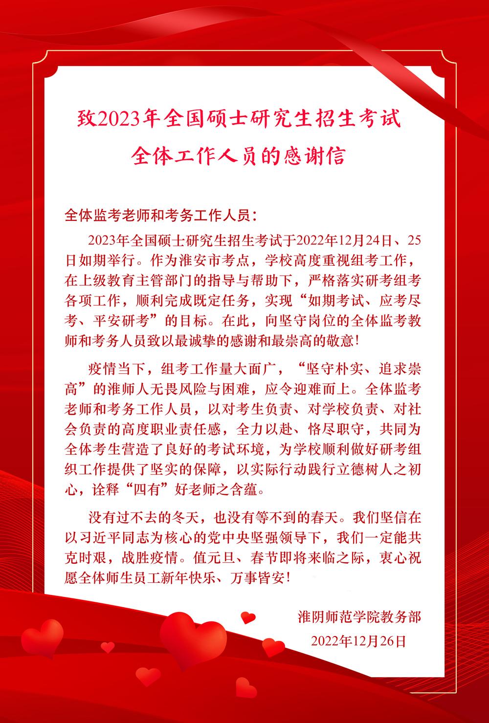 致2023年全国硕士研究生招生考试全体工作人员的感谢信