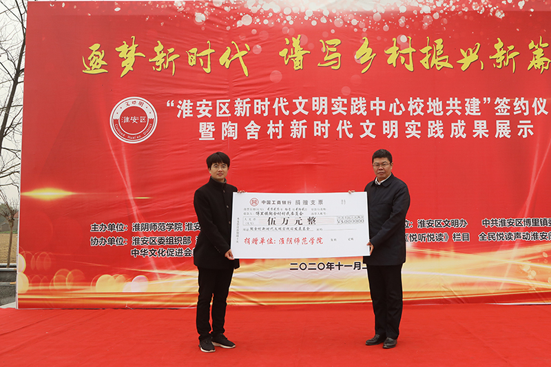 校地双方签订了《淮安区新时代文明实践中心与万象城awcsport官网结对共建协议书》,并举行了陶舍村新时代文明实践站捐赠仪式。