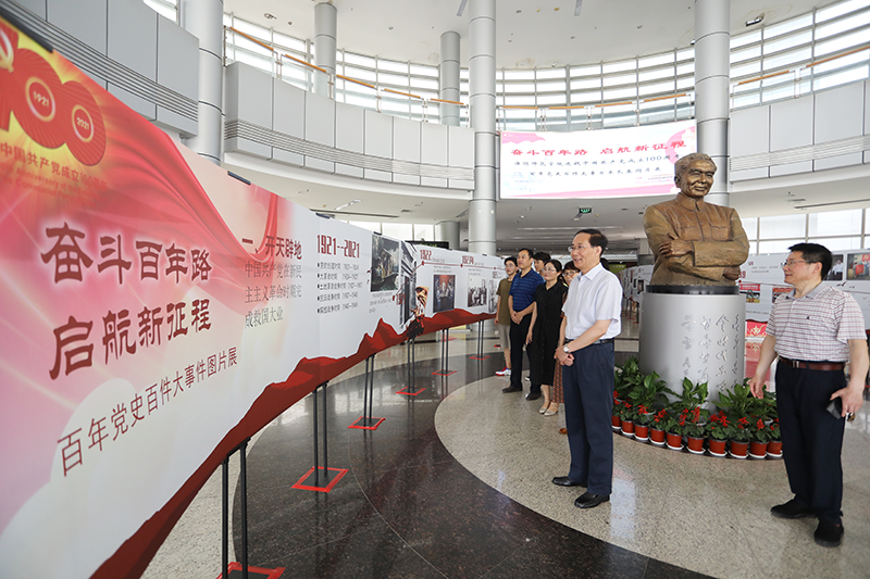 淮师新闻网6月30日电(记者 唐瑀)为了庆祝中国共产党成立100周年,回顾党的光辉历程,讴歌党的丰功伟绩,6月30日,万象城awcsport官网“奋斗百年路 启航新征程”百年党史百件大事图片展在长江路校区图书馆内开展。校党委书记朱汉清,党委副书记、纪委书记金叶玲与师生代表一同参观图片展。