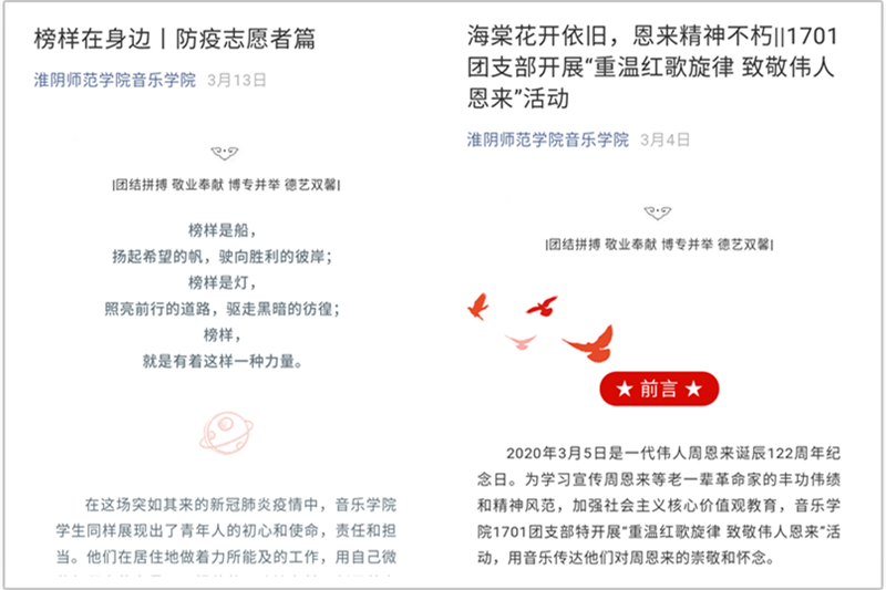 发起一次学周践周志愿服务。鼓励学生积极参与所在地的防控抗疫志愿服务活动,并通过线上经验分享,在实际行动中弘扬恩来精神,彰显淮师学子的昂扬风貌与青春力量。结合专业优势,开展“重温红歌旋律 致敬伟人恩来”红歌颂唱活动,在红歌传唱中重温革命荣光,感受伟人情怀。选树一批榜样典型。征集学生在家线上学习与练功的笔记、心得、图片和视频,借助 “在线学习”“专业练习”线上分享,充分展现同学们在疫情期间“停课不停学”的积极风貌,引导学生积极学习,提升自我,并为同学们提供一个展示优秀典型、交流学习经验的平台,激励同学对标榜样典型,增强专业能力。